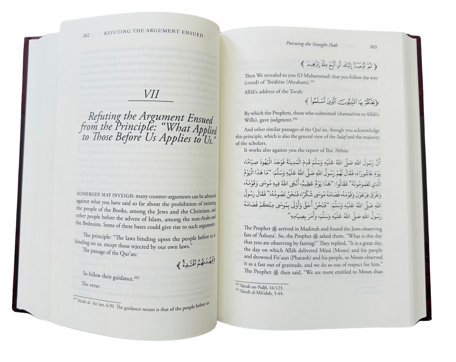 262 REFUTING THE ARGUMENT ENSUED a Pursuing the Straight Path 263 ثُمَّ أَوْحَيْنَا إِلَيْكَ أَنِ اتَّبِعْ مِلَّةَ إِبْرَاهِيمَ ) Then We revealed to you (O Muhammad) that you follow the way (creed) of 'Ibrahim (Abraham),393 Allah's address of the Torah: VII Refuting the Argument Ensued from the Principle: "What Applied to Those Before Us Applies to Us." يحكمُ بِهَا النَّبِيُّونَ الَّذِينَ أَسْلَمُوا ) By which the Prophets, those who submitted (themselves to Allah's Wills), gave judgment.394 And other similar passages of the Qur'an, though you acknowledge this principle, which is also the general view of the Salaf and the majority of the scholars. It works also against you the report of Ibn 'Abbas: SOMEBODY MAY INVEIGH: many counter-arguments can be advanced against what you have said so far about the prohibition of imitating the people of the Books, among the Jews and the Christians, and other people before the advent of Islam, among the non-Arabs and the Bedouins. Some of these bases could give rise to such arguments: The principle: "The laws binding upon the people before us is binding on us, except those rejected by our own laws." The passage of the Qur'an: So follow their guidance.392 The verse: الهُدَهُمُ اقْتَية ) 992 Surah al-An' am, 6:90. The guidance meant is that of the people before us. أَنَّ رَسُولَ اللهِ صَلَّى اللهُ عَلَيْهِ وَسَلَّمَ قَدِمَ الْمَدِينَةَ فَوَجَدَ الْيَهُودَ صِيَامًا، يَوْمَ عَاشُورَاءَ، فَقَالَ لَهُمْ رَسُولُ اللهِ صَلَّى اللَّهُ عَلَيْهِ وَسَلَّمَ: مَا هَذَا الْيَوْمُ الَّذِي تَصُومُونَهُ فَقَالُوا: هَذَا يَوْمُ عَظِيمُ، أَنْجَى اللَّهُ فِيهِ مُوسَى وَقَوْمَهُ، وَغَرَّقَ فِرْعَوْنَ وَقَوْمَهُ، فَصَامَهُ مُوسَى شُكْرًا، فَنَحْنُ نَصُومُهُ، فَقَالَ رَسُولُ اللهِ صَلَّى اللهُ عَلَيْهِ وَسَلَّمَ: فَنَحْنُ أَحَقُّ وَأَوْلَى بِمُوسَى مِنْكُمْ فَصَامَهُ رَسُولُ اللهِ صَلَّى اللهُ عَلَيْهِ وَسَلَّمَ، وَأَمَرَ بِصِيَامِهِ" The Prophet arrived in Madinah and found the Jews observing fast of 'Ashura'. So, the Prophet asked them, "What is this day that you are observing by fasting?" They replied, "It is a great day, the day on which Allah delivered Müsä (Moses) and his people and drowned Fir'aun (Pharaoh) and his people, so Moses observed it as a fast out of gratitude, and we do so out of respect for him." The Prophet then said, "We are more entitled to Moses than 393 Surah an-Nahl, 16:123. 394 Surah al-Ma'idah, 5:44.