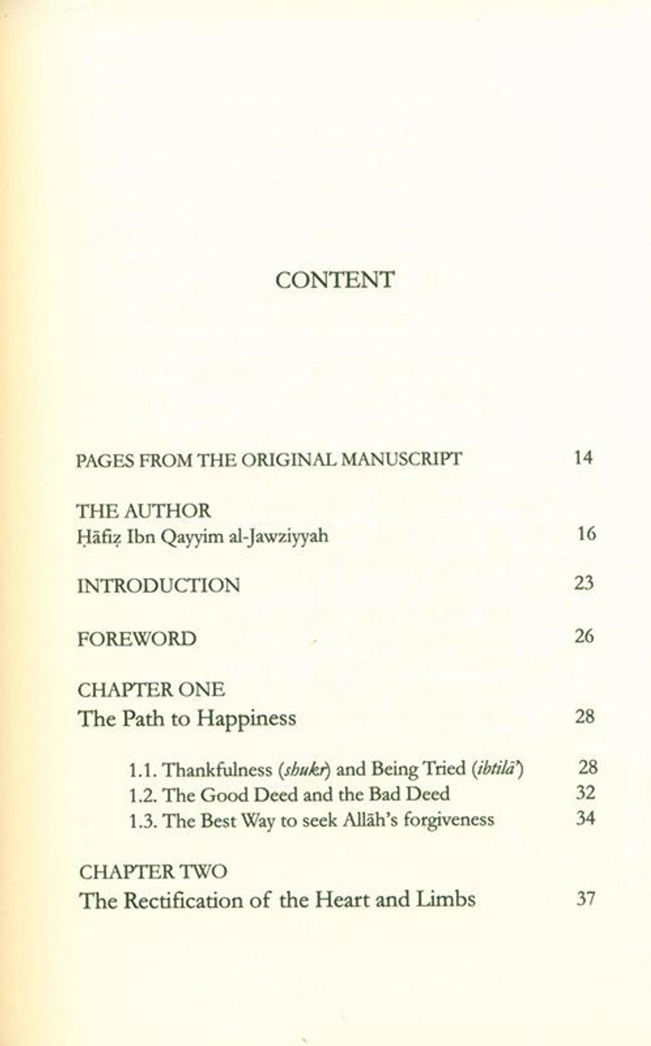 CONTENT PAGES FROM THE ORIGINAL MANUSCRIPT 14 THE AUTHOR Hafiz Ibn Qayyim al-Jawziyyah INTRODUCTION FOREWORD CHAPTER ONE The Path to Happiness 1.1. Thankfulness (shukr) and Being Tried (ibtila) 1.2. The Good Deed and the Bad Deed 1.3. The Best Way to seek Allah's forgiveness CHAPTER TWO The Rectification of the Heart and Limbs 16 23 26 28 28 32 34 37