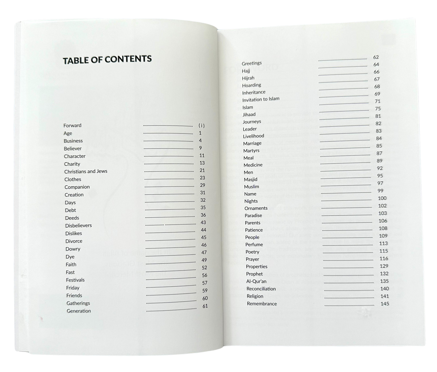TABLE OF CONTENTS Greetings Hajj Hijrah 62 245 64 66 67 Hoarding 68 Inheritance 69 Invitation to Islam 71 Islam 75 Jihaad 81 Journeys Forward Age Business (i) 82 Leader 1 83 Livelihood 4 84 Marriage Believer 9 85 Martyrs Character 11 87 Meal Charity 13 89 Medicine Christians and Jews 21 92 Men Clothes 23 95 Masjid Companion 29 97 Muslim Creation 31 99 Name 32 100 Days Nights 35 102 Debt Ornaments 36 Deeds Paradise 103 43 Parents 106 Disbelievers 44 Patience 108 Dislikes 45 People 109 Divorce 46 Perfume 113 Dowry 47 Poetry 115 Dye 49 Prayer 116 Faith 52 Properties 129 Fast 56 Prophet 132 Festivals 57 Al-Qur'an 135 Friday 59 Reconciliation 140 Friends 60 Religion 141 Gatherings 61 Remembrance 145 Generation
