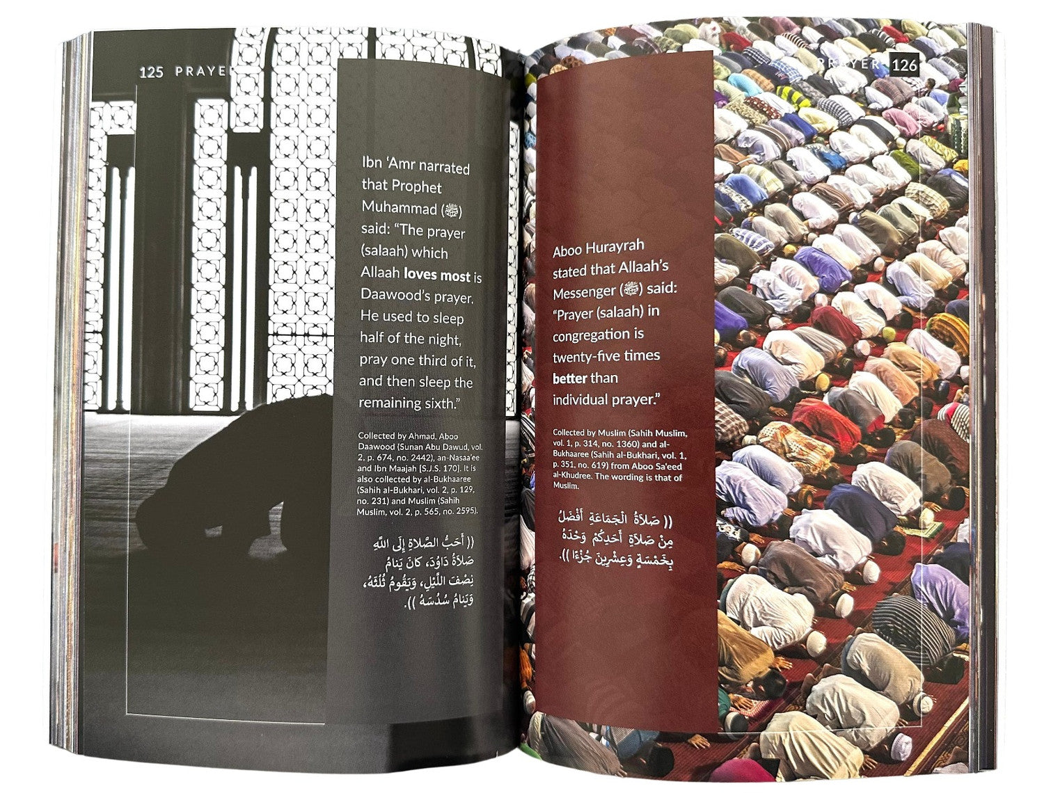 125 PRAYER Ibn 'Amr narrated that Prophet Muhammad() said: "The prayer (salaah) which Allaah loves most is Daawood's prayer. He used to sleep half of the night, pray one third of it, and then sleep the remaining sixth." Collected by Ahmad, Aboo Daawood (Sunan Abu Dawud, vol. 2. p. 674, no. 2442), an-Nasaa'ee and Ibn Maajah (S.J.S. 170]. It is also collected by al-Bukhaaree (Sahih al-Bukhari, vol. 2, p. 129, no. 231) and Muslim (Sahih Muslim, vol. 2, p. 565, no. 2595). Aboo Hurayrah stated that Allaah's Messenger() said: "Prayer (salaah) in congregation is twenty-five times better than individual prayer." Collected by Muslim (Sahih Muslim, vol. 1, p. 314, no. 1360) and al- Bukhaaree (Sahih al-Bukhari, vol. 1, p. 351, no. 619) from Aboo Sa'eed al-Khudree. The wording is that of Muslim. (( صَلَاةُ الْجَمَاعَةِ أَفْضَلُ مِنْ صَلَاةِ أَحَدِكُمْ وَحْدَهُ بِخَمْسَةٍ وَعِشْرِينَ جُزْءًا )). (( أَحَبُّ الصَّلاةِ إِلَى اللَّهِ صَلاةُ دَاوُدَ، كَانَ يَنامُ نِصْفَ اللَّيْلِ، وَيَقُومُ ثُلُثَهُ، وَيَنامُ سُدُسَهُ )). BRYER 126