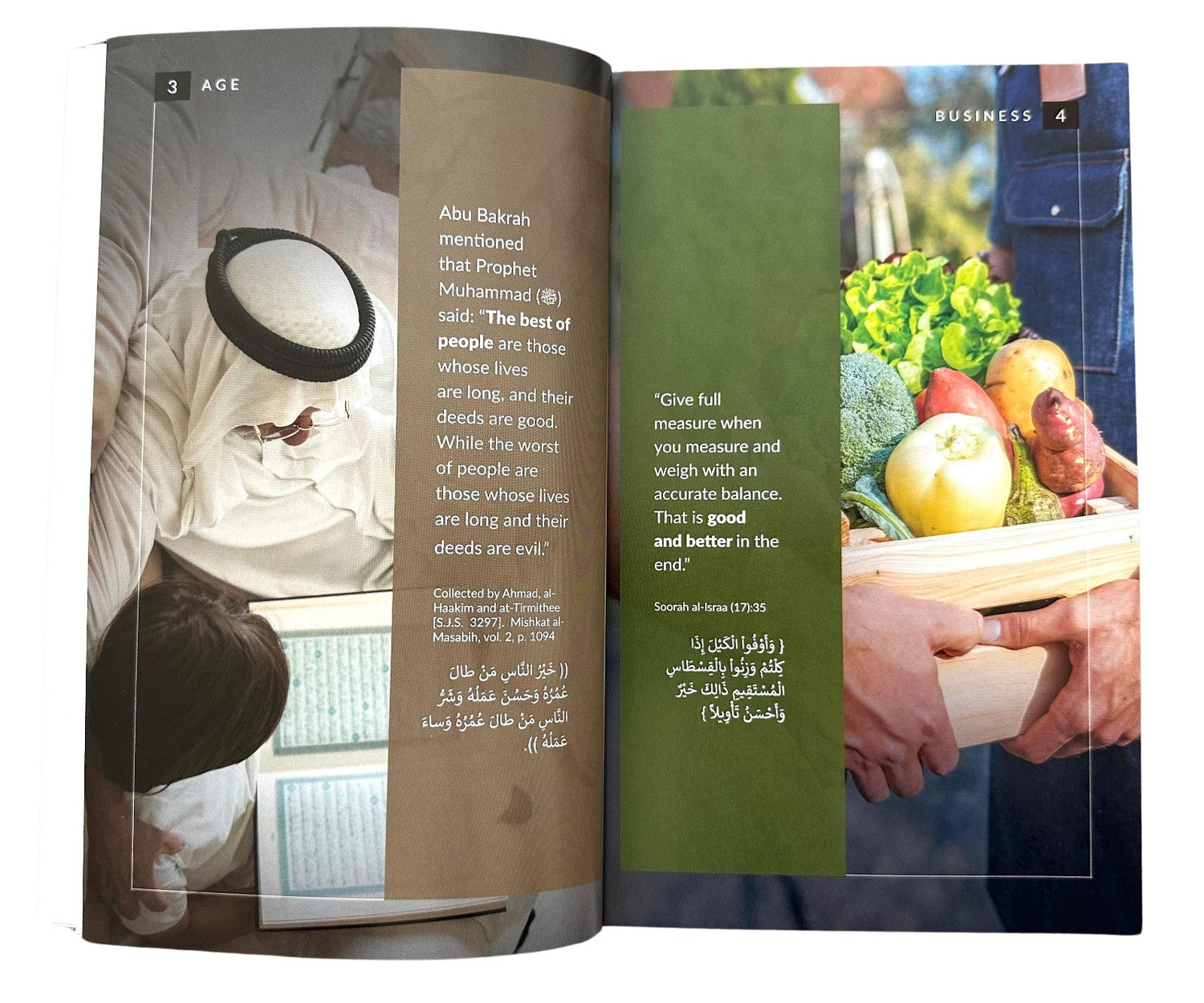 3 AGE Abu Bakrah mentioned that Prophet Muhammad() said: "The best of people are those whose lives are long, and their deeds are good. While the worst of people are those whose lives are long and their deeds are evil." Collected by Ahmad, al- Haakim and at-Tirmithee [S.J.S. 3297]. Mishkat al- Masabih, vol. 2, p. 1094 "Give full measure when you measure and weigh with an accurate balance. That is good and better in the end." Soorah al-Israa (17):35 { وَأَوْفُوا الْكَيْلَ إِذَا كِلْتُمْ وَزِنُوا بِالْقِسْطَاسِ الْمُسْتَقِيمِ ذَالِكَ خَيْرٌ وَأَحْسَنُ تَأْوِيلاً } (( خَيْرُ النَّاسِ مَنْ طَالَ عُمُرُهُ وَحَسُنَ عَمَلُهُ وَشَرُّ النَّاسِ مَنْ طَالَ عُمُرُهُ وَساءَ عَمَلُهُ )) . BUSINESS 4